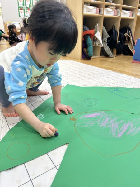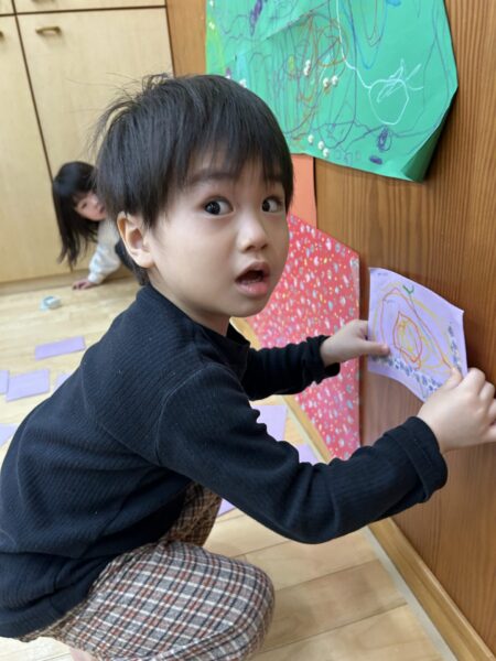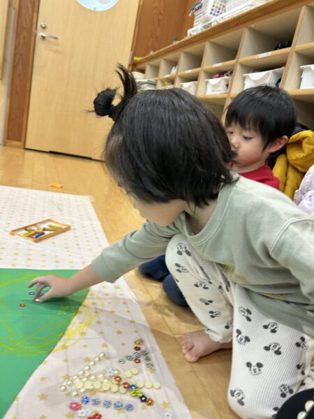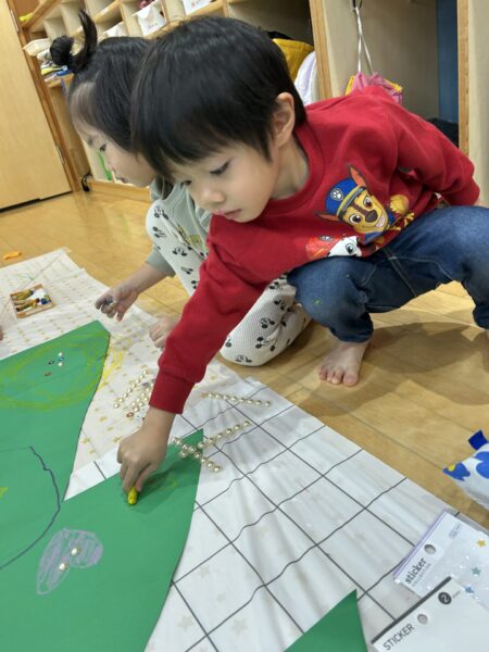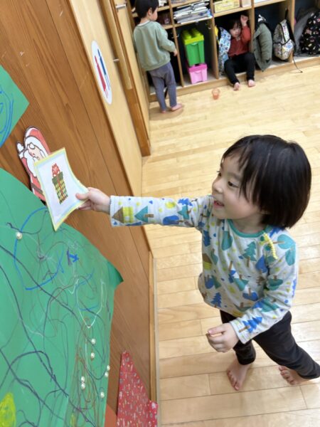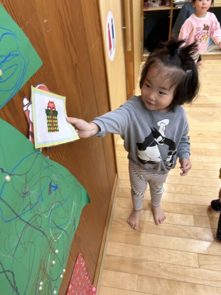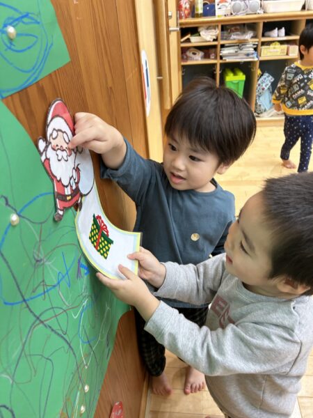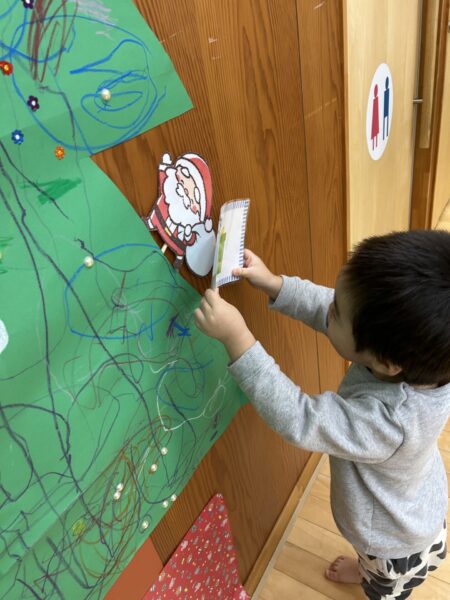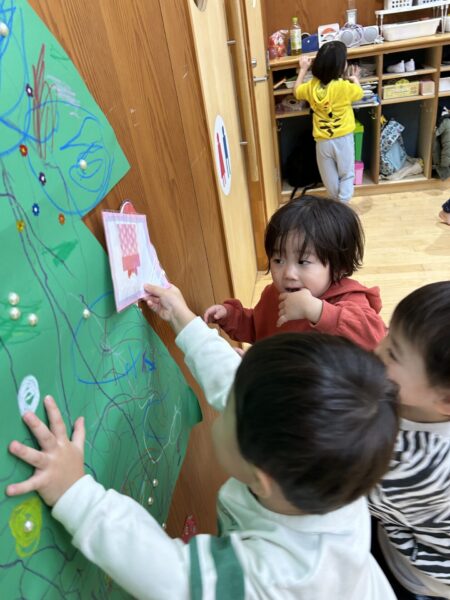 みんなで絵を描いたりシールを貼ったりして大きなクリスマスツリーを作りました🎄🌟