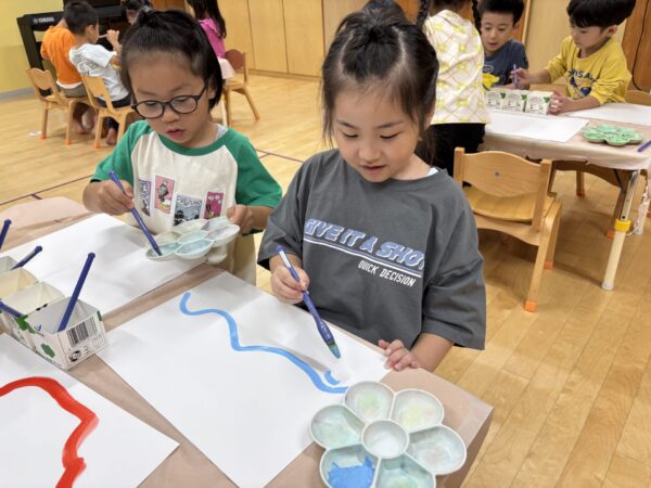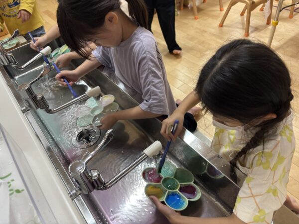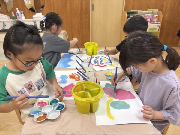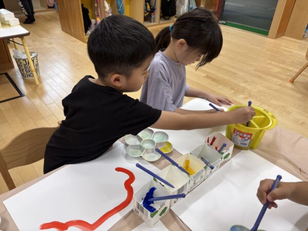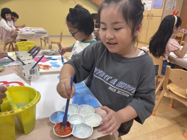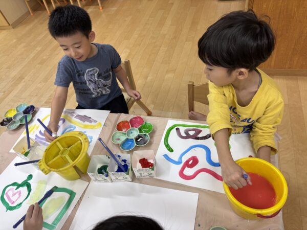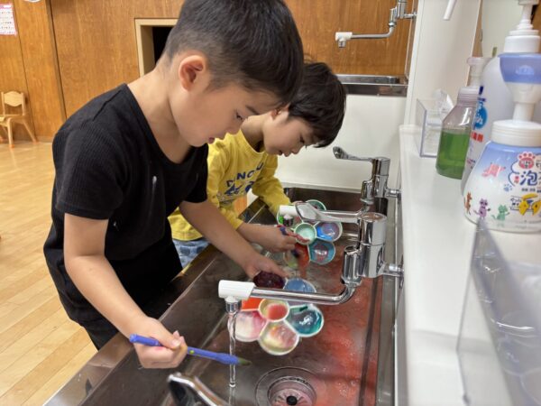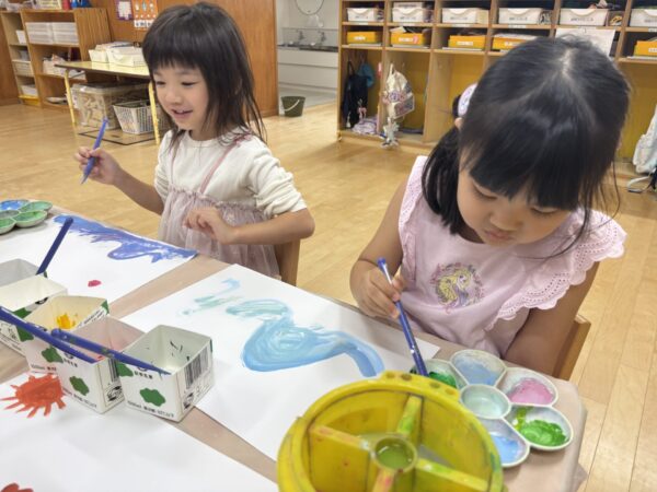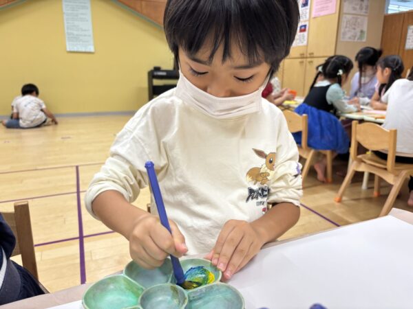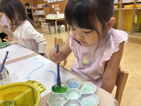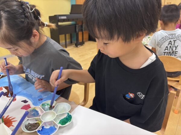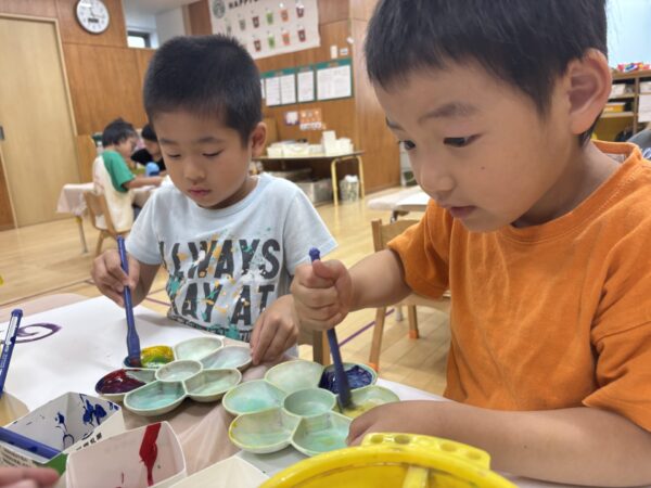 『何色を混ぜようかな〜?』『何色を作ろうかな〜?』と友達と会話を楽しみながら、パレットに絵の具を乗せて混ぜていきます🖌