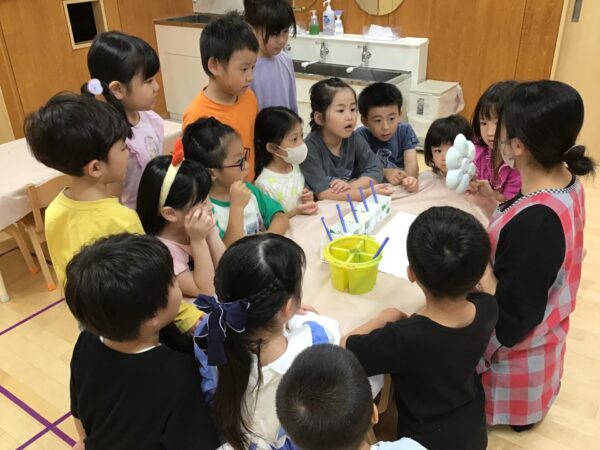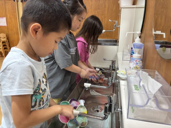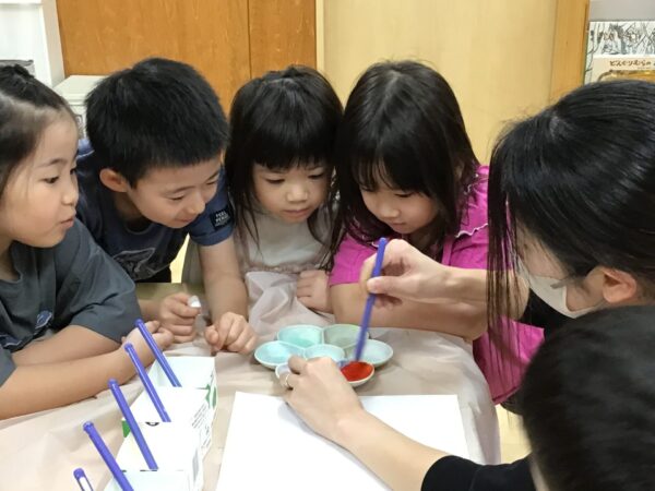 『茶色になった🤎』『黄緑になった💚』と混ぜてできた色を見て大興奮の子どもたち😊