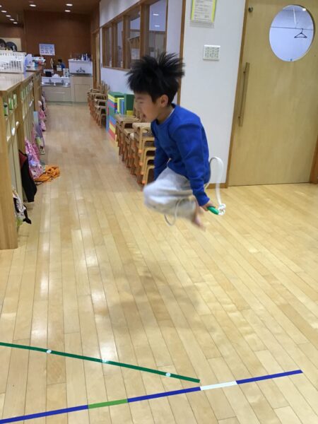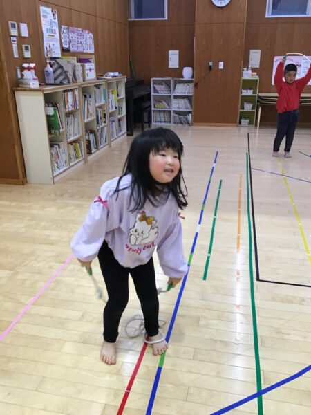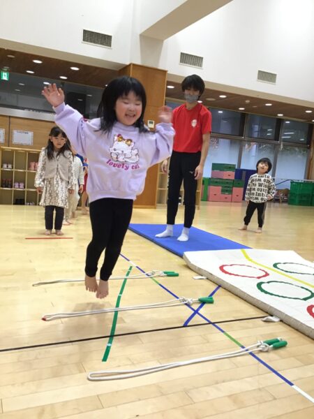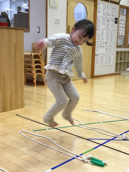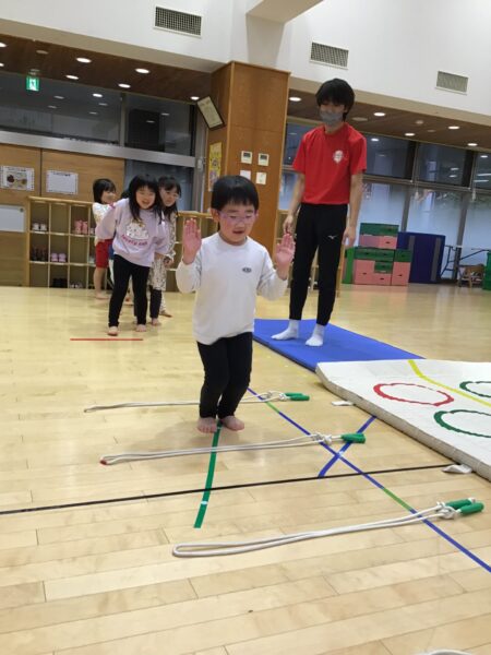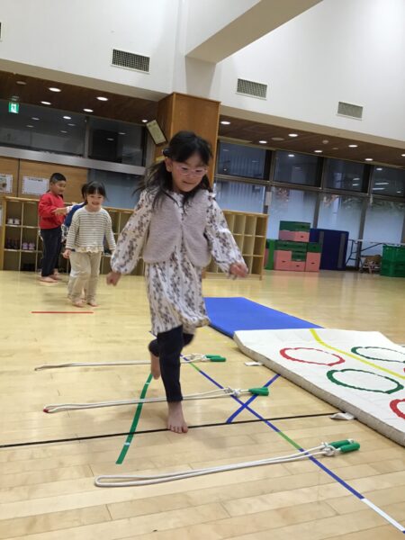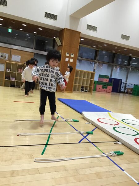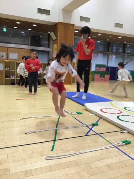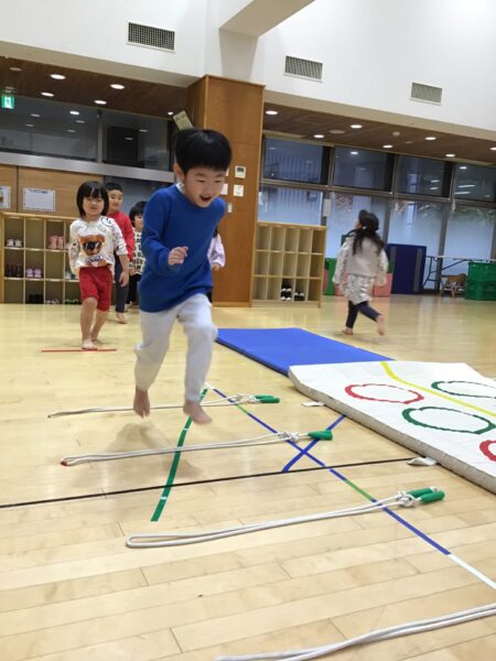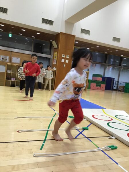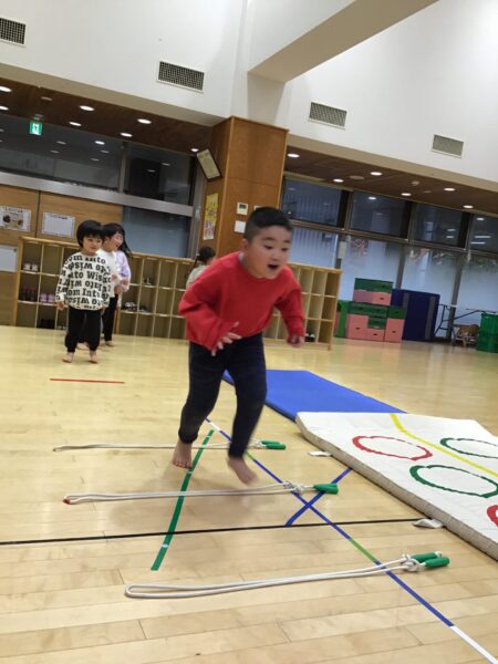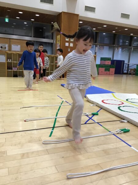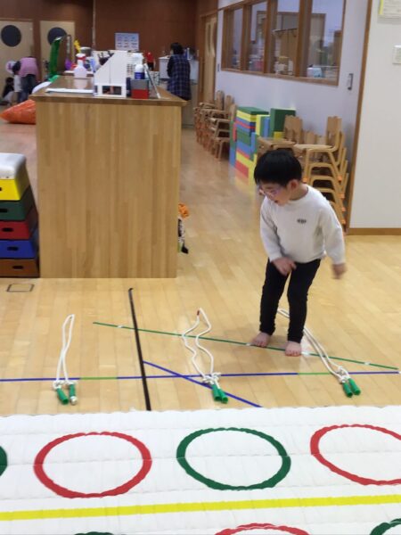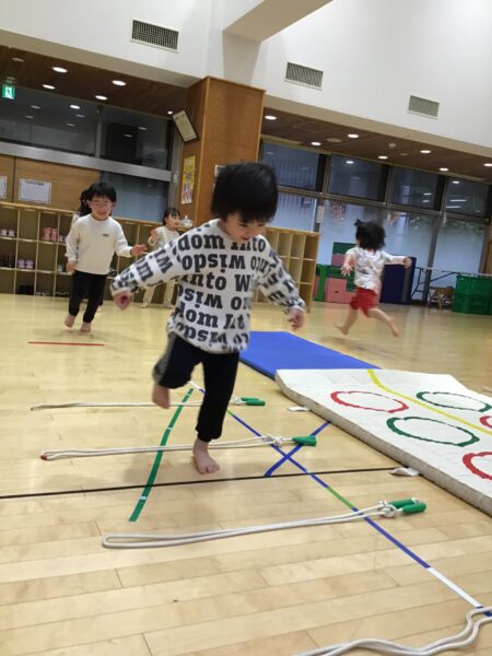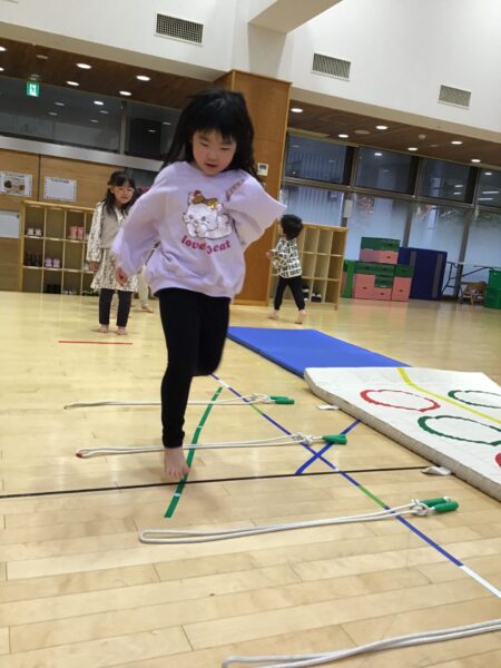 マットのまわりを走ったり、ジャンプしたりします✨間にあるなわとびは踏まないように進みますよ!