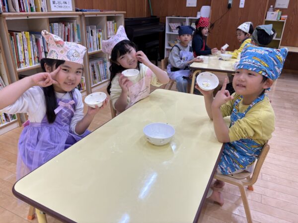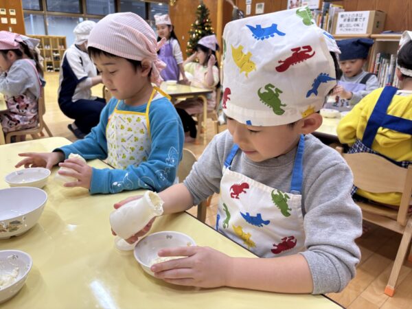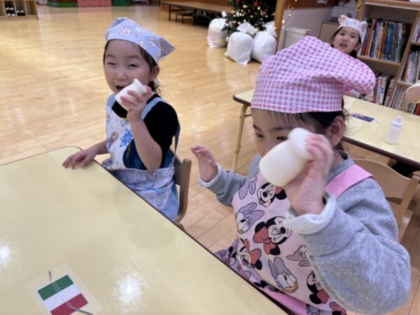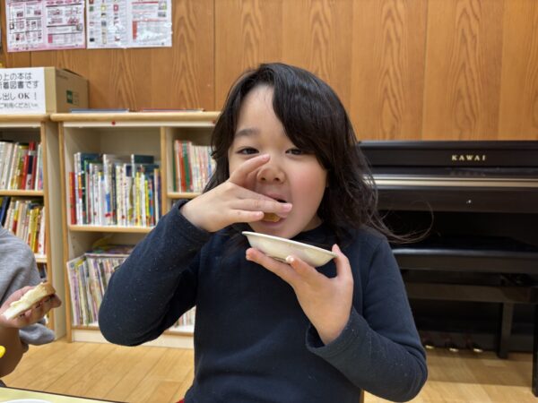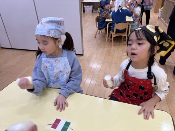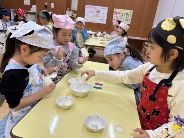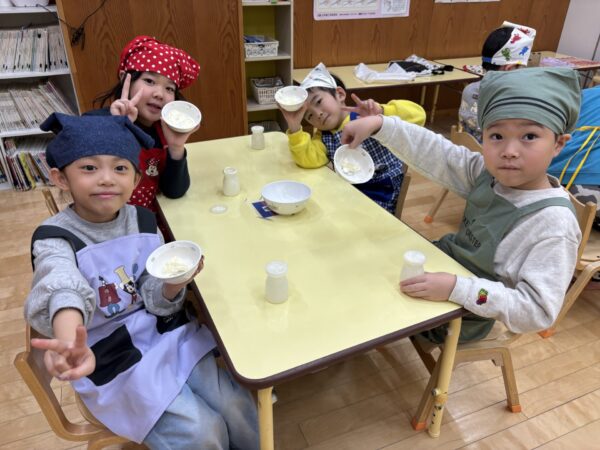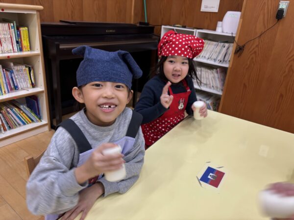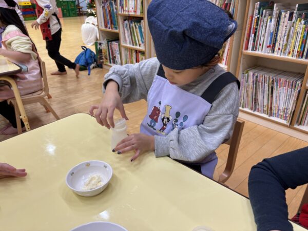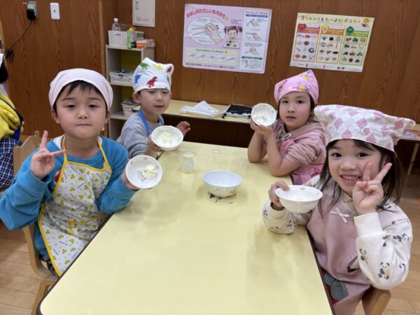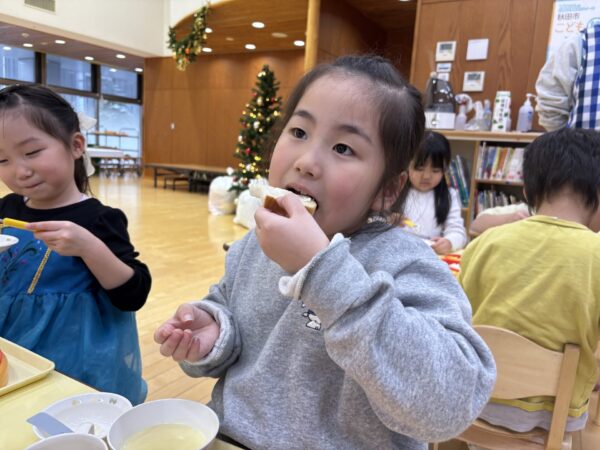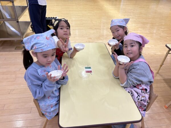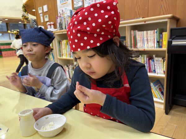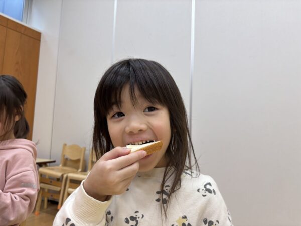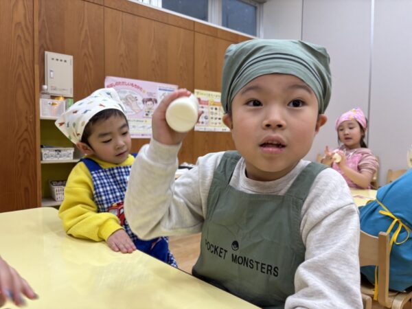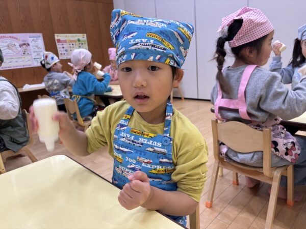 給食の時間に、パンに作ったバターを塗って食べました😋🍞