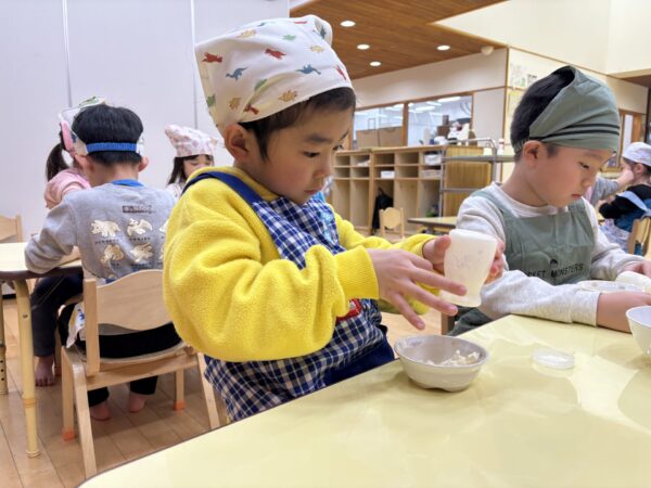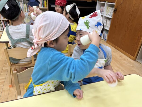 容器を耳に当て、シャカシャカ音が鳴るか確認する子どもたち☺️