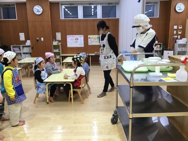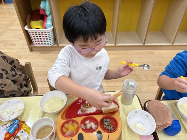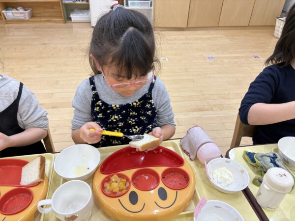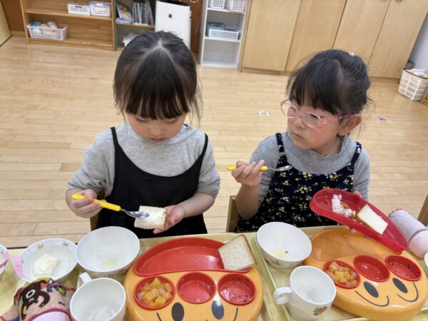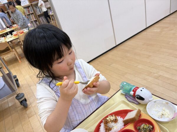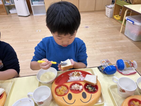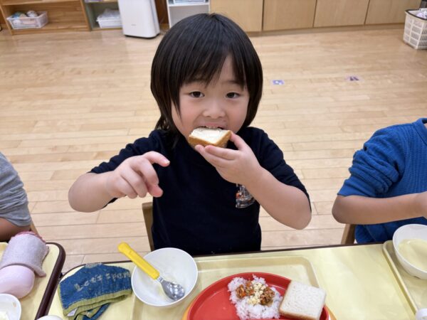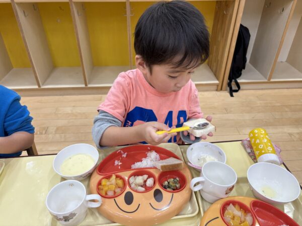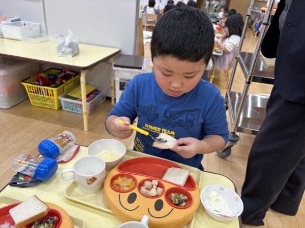 給食の時間に自分たちで作ったバターをパンにぬって食べました♪