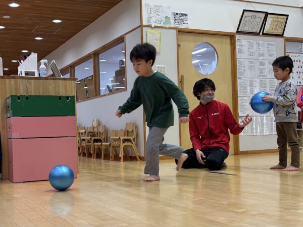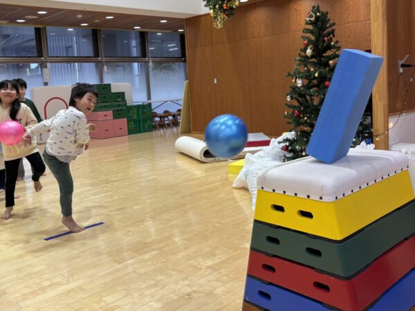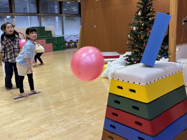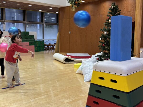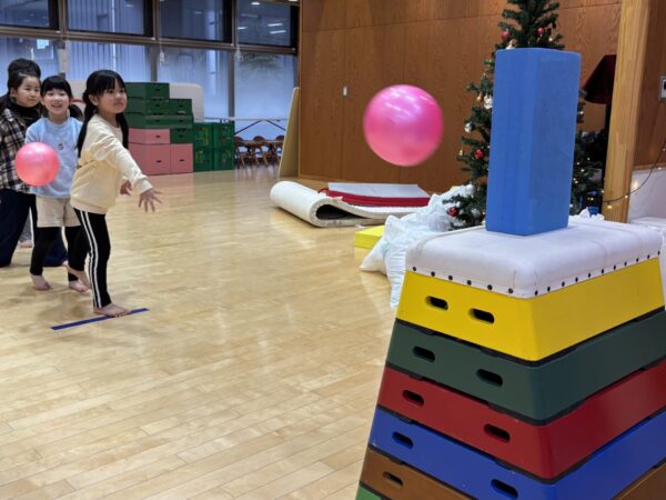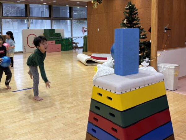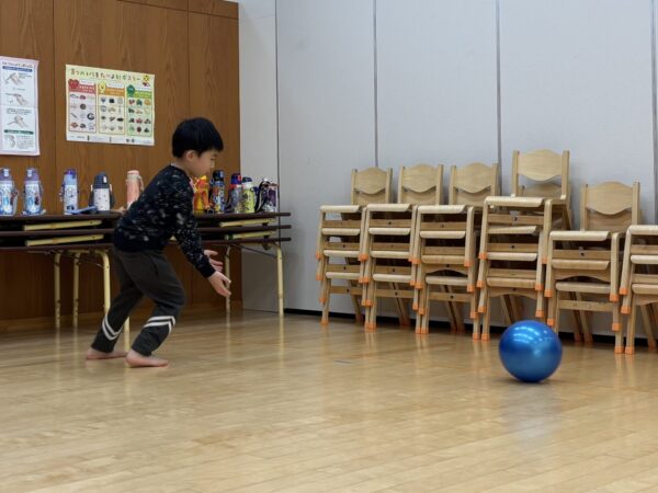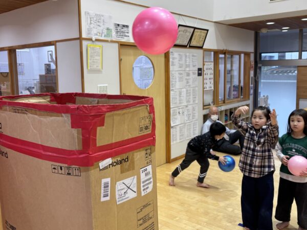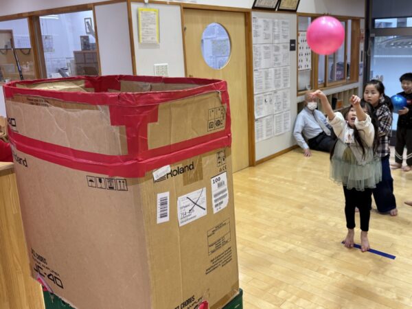 ボールを投げる角度や力加減を考えながら、箱を狙って投げていましたよ😊