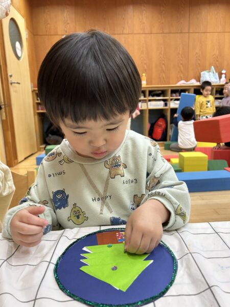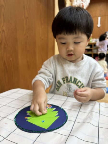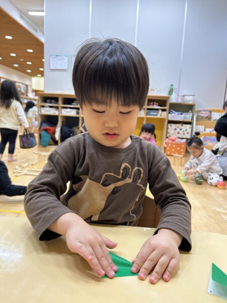 うさぎ組さんのクリスマス製作は、折り紙でクリスマスツリーを作りましたよ!
