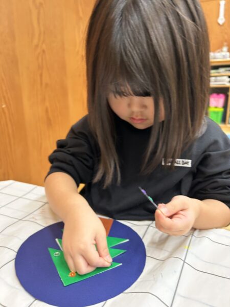 目印の丸と丸を合わせて三角と四角の形を作り、ツリーができました🎄✨