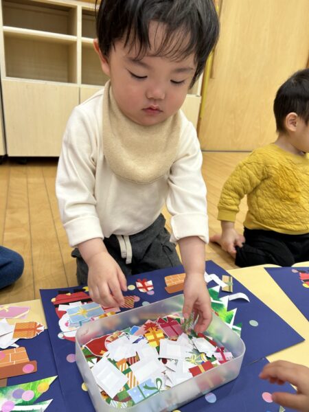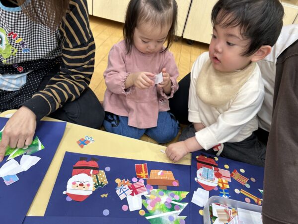 次はサンタさんとツリーの周りにプレゼントを貼っていきます!