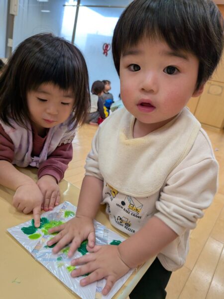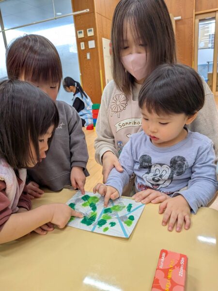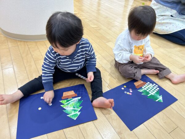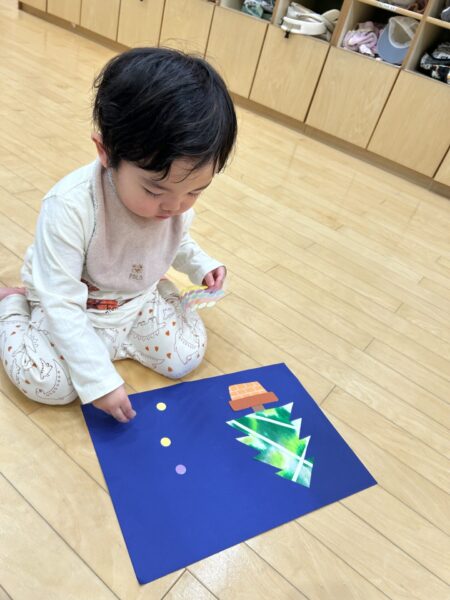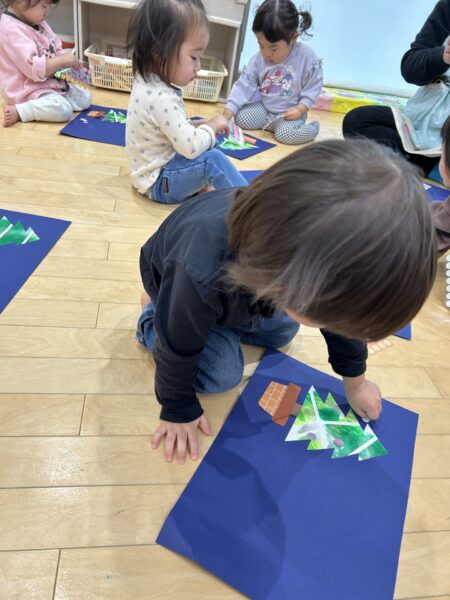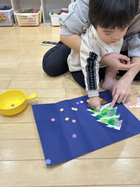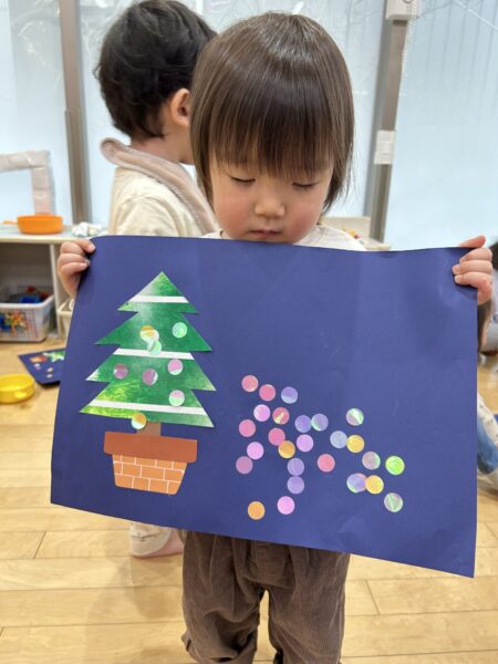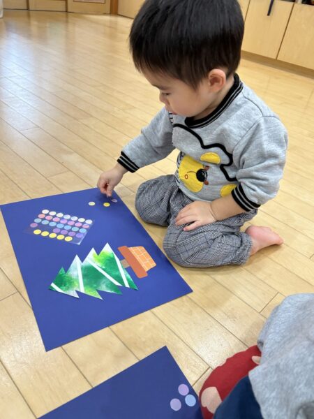 ツリーの形ができたら、みんなが大好きなキラキラシールを貼っていきます😊