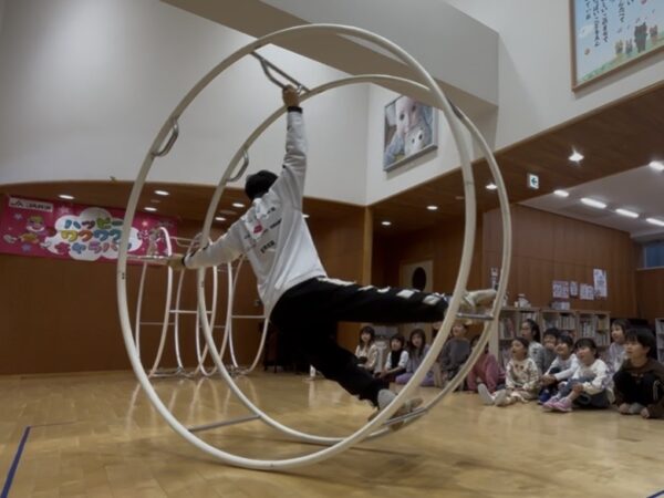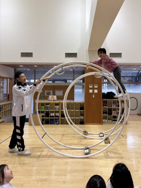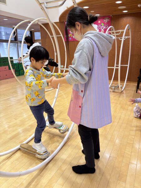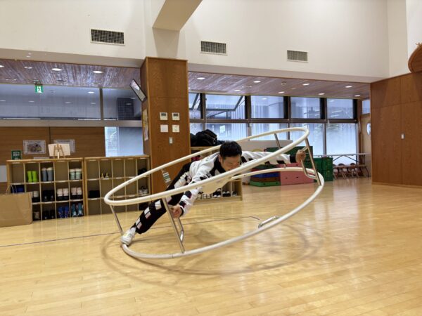 『実際にやってみよう!』ということで、まずは足でバランスをとり、横にゆらゆらとシーソーのように揺れてみます!