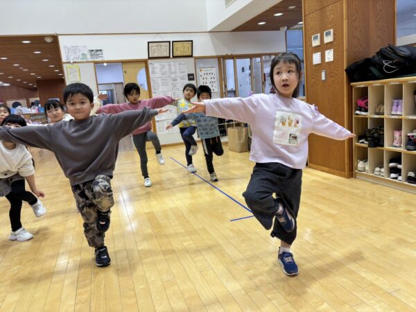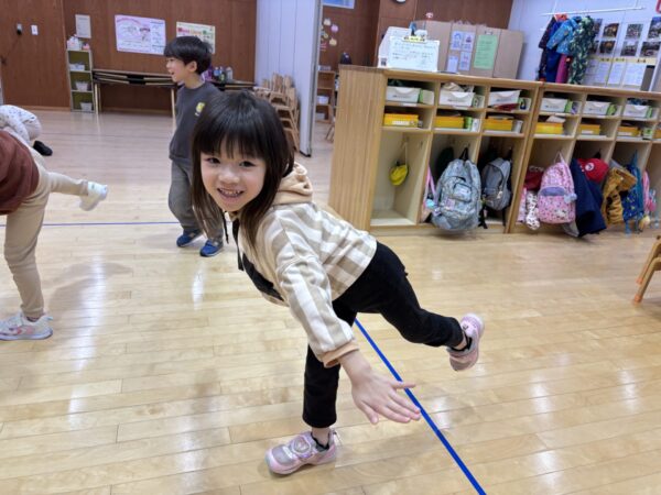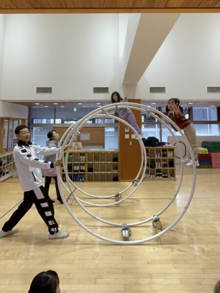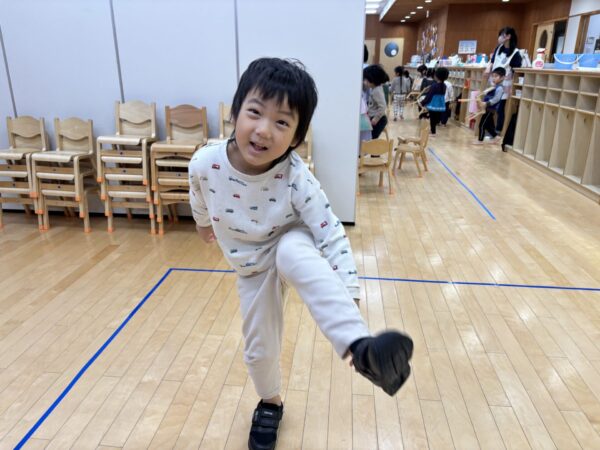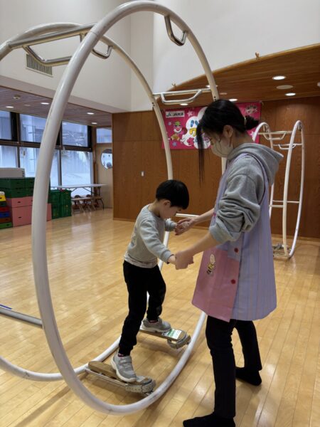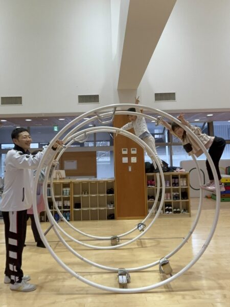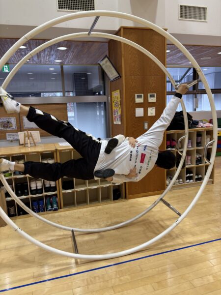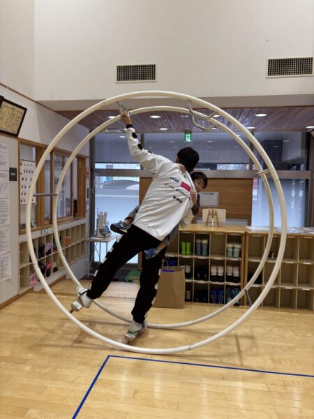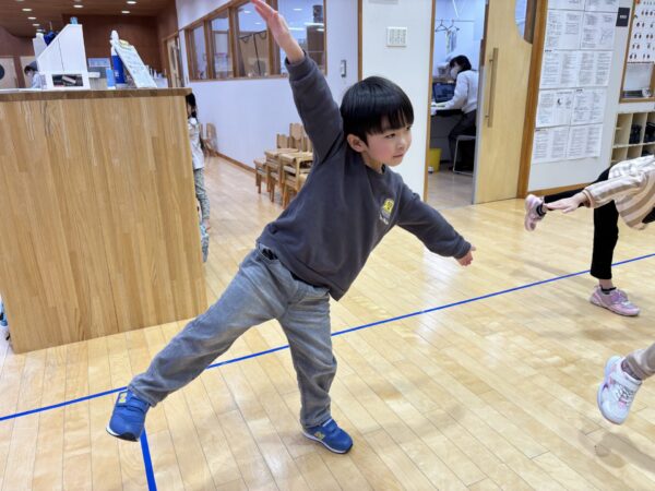 『実際にやってみよう!』ということで、まずは足でバランスをとり、横にゆらゆらとシーソーのように揺れてみます!