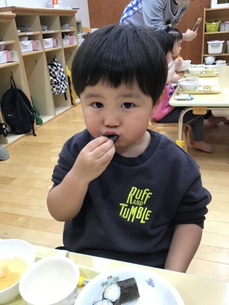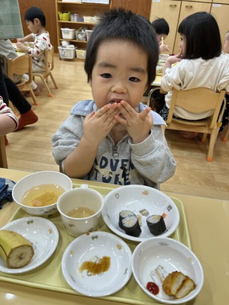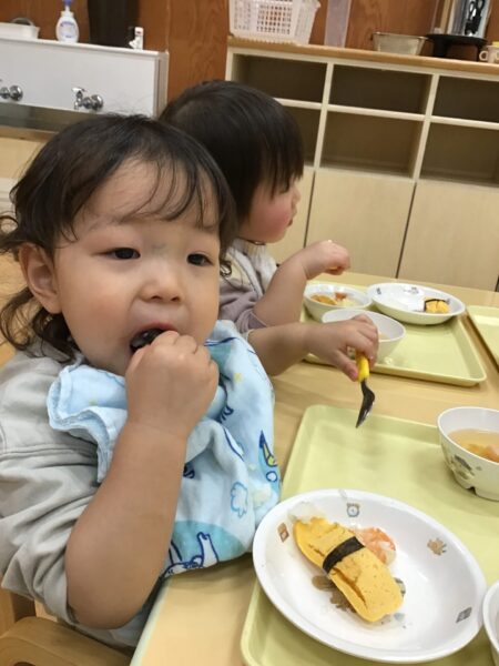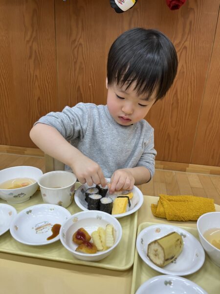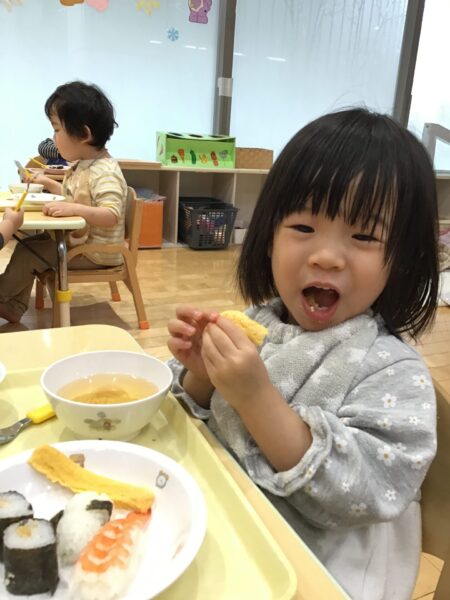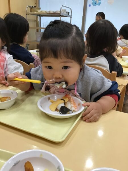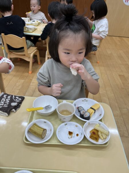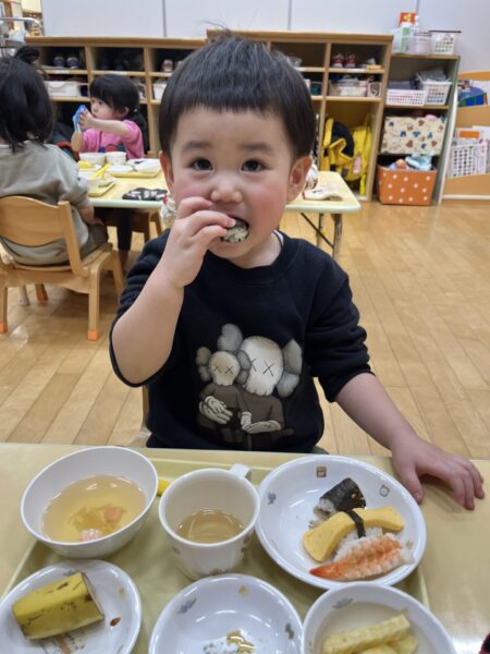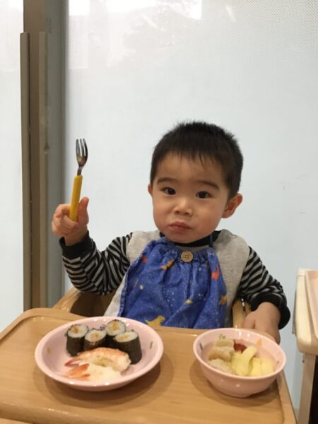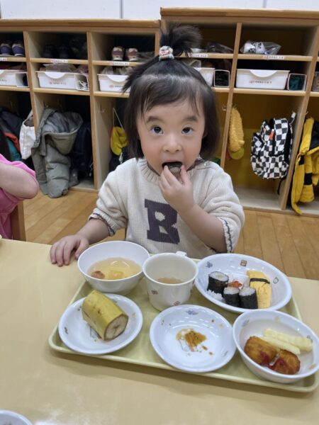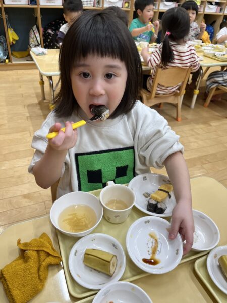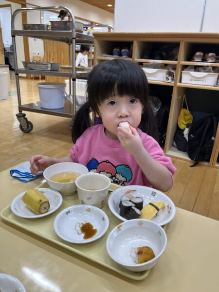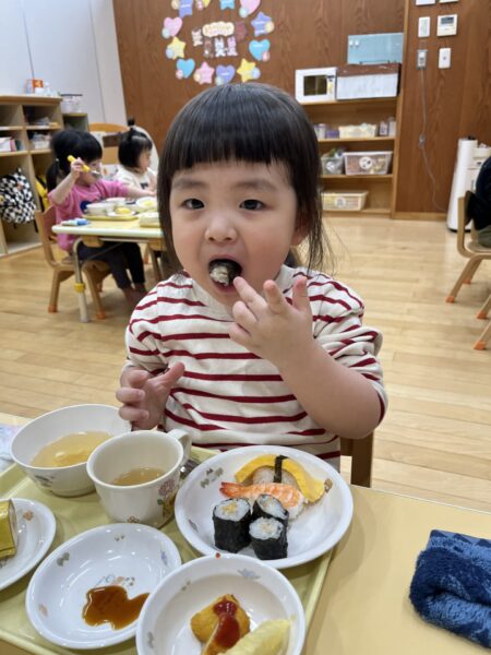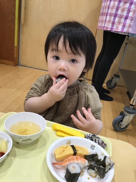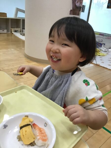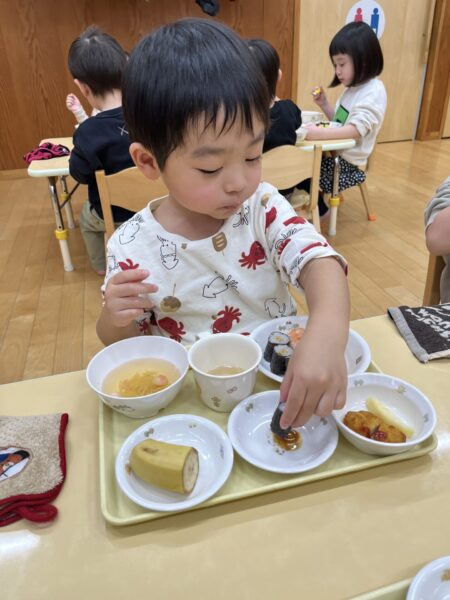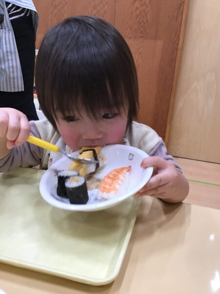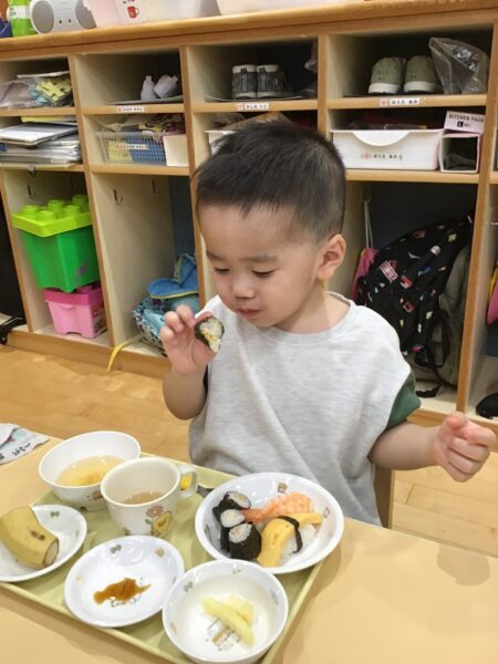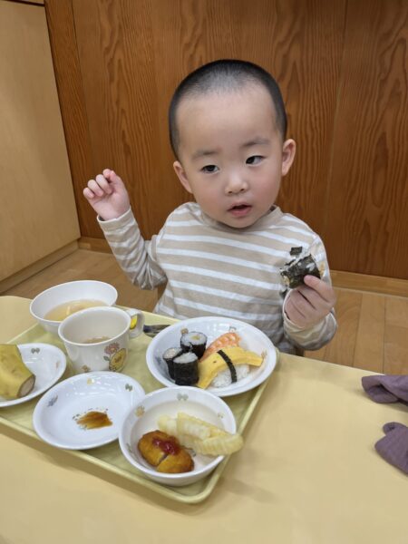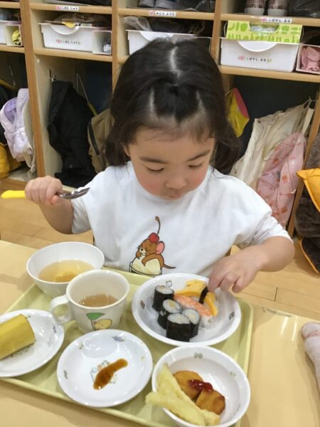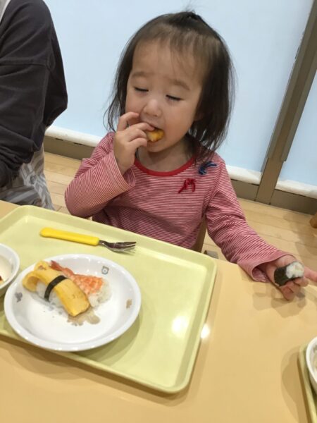 小さいクラスは、トレーの上でお寿司を楽しみました。
