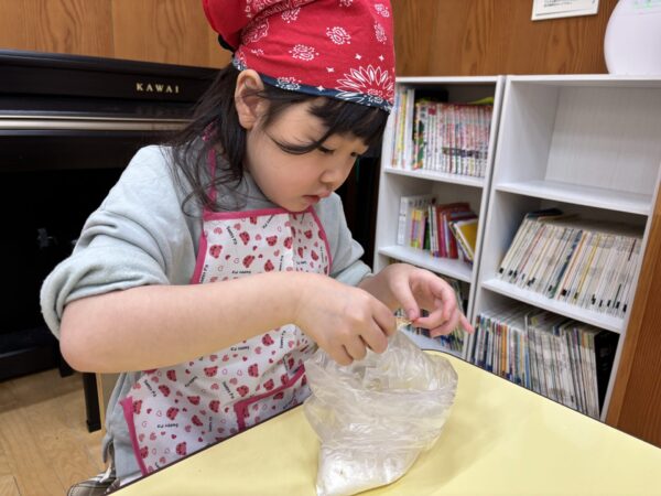 まずは、作り方を教えてもらい、粉が入った袋の中に牛乳、油、メープルシロップを入れます!
