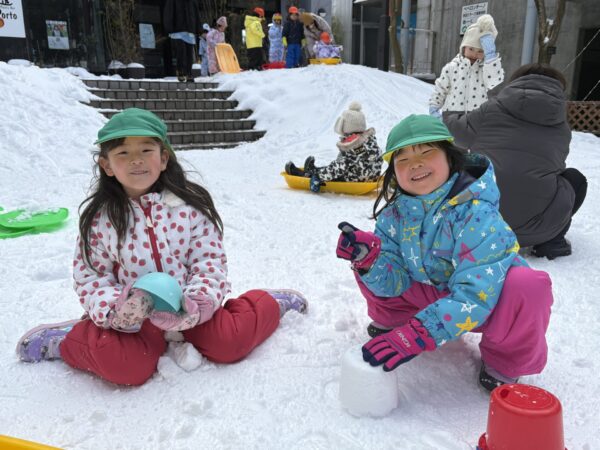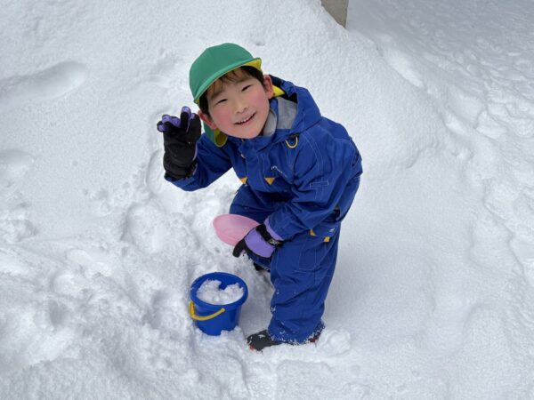 雪をバケツに入れてひっくり返して遊んだり、