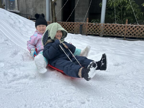 雪山の上からシューっと滑ります!山の上に立つと高さがありましたが、みんな嬉しそうにソリ滑りを楽しんでいました⭐️