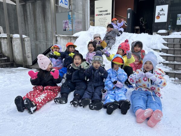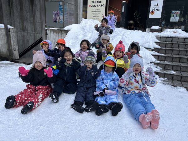 お友達と一緒に雪遊びを満喫!「寒くない?」という先生の声に「ぜーんぜん!」「もっと遊びたーい😆」と元気いっぱいな子どもたちです🎵