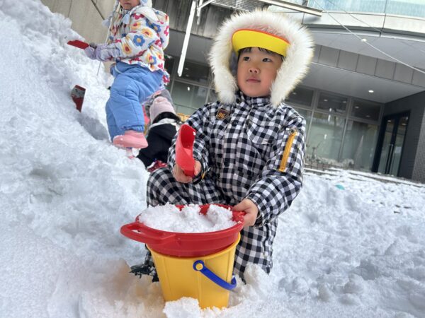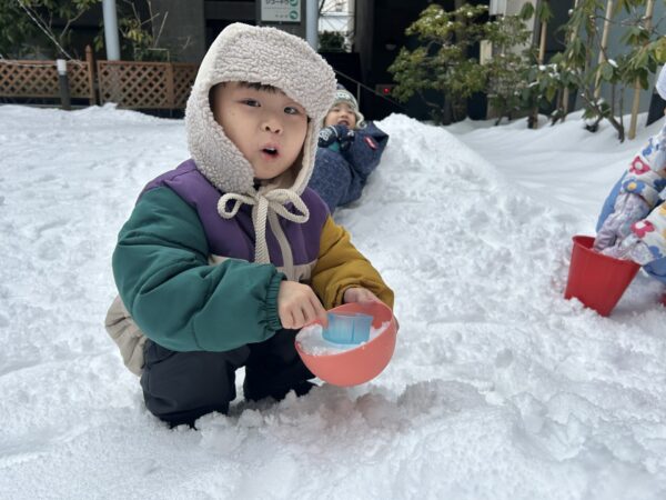 バケツやおわんなど、様々な容器に雪を集めて遊んでいます!ザクザク、シャリシャリする音を楽しみながら雪を集めていましたよ⭐️