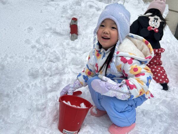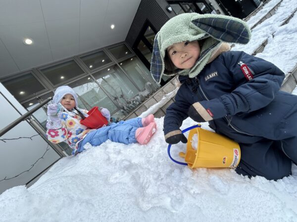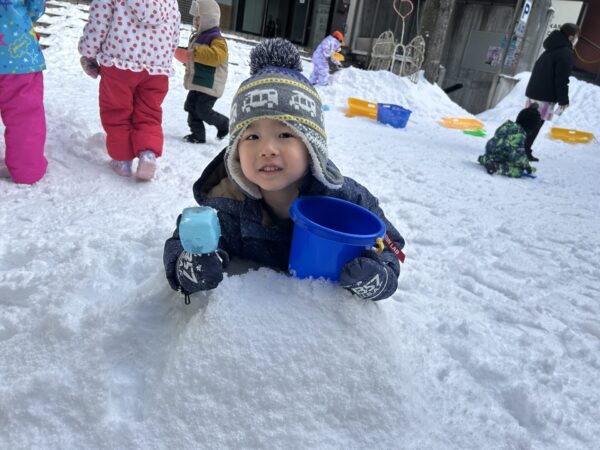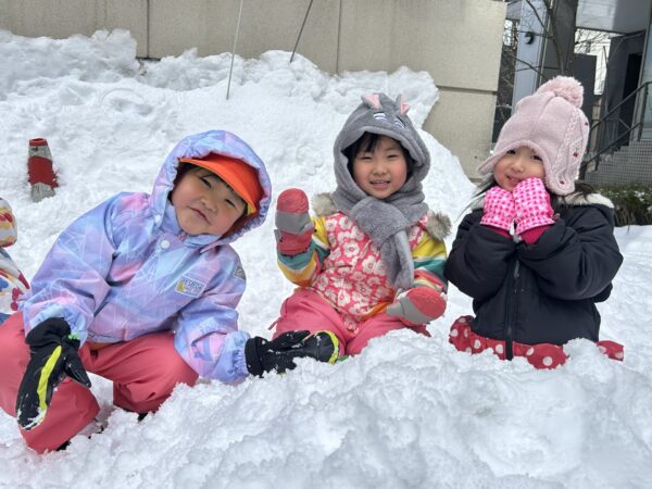 お友達と一緒に雪遊びを満喫!「寒くない?」という先生の声に「ぜーんぜん!」「もっと遊びたーい😆」と元気いっぱいな子どもたちです🎵