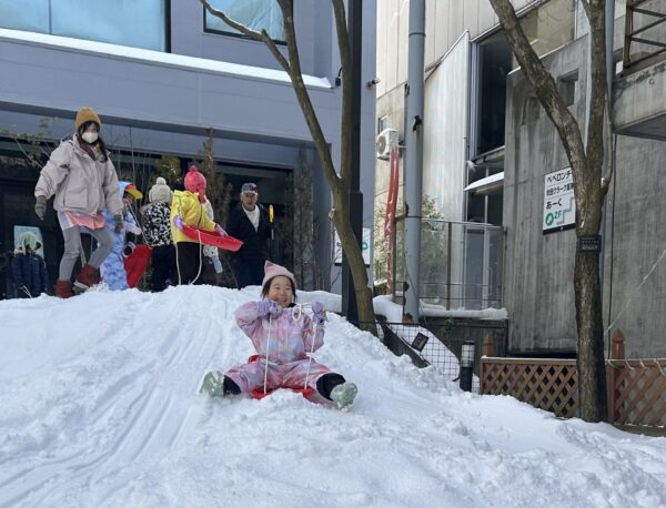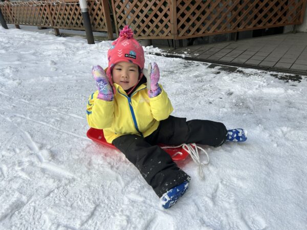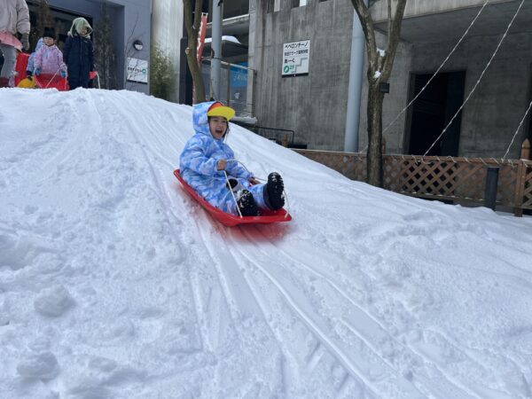 雪山の上からシューっと滑ります!山の上に立つと高さがありましたが、みんな嬉しそうにソリ滑りを楽しんでいました⭐️