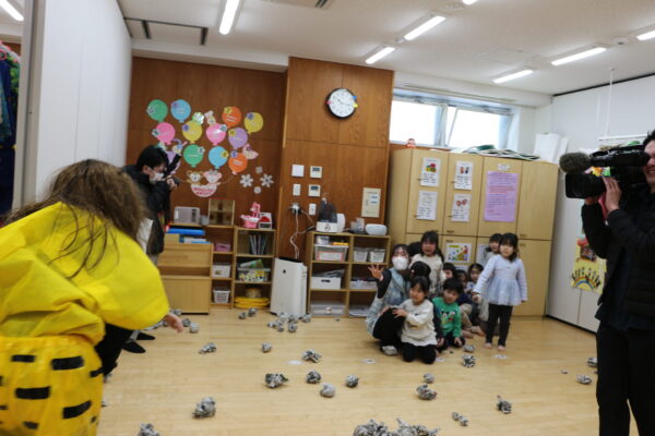 豆に見立てた新聞紙ボールをもってスタンバイ!