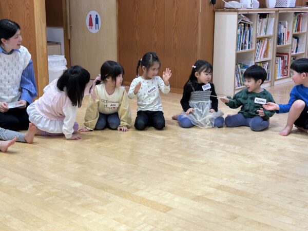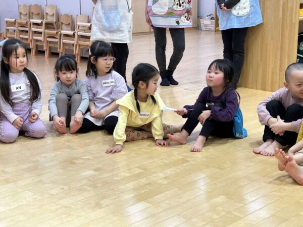 綺麗な丸が作れたら、単語が付いたカードを隣のお友達に渡します!