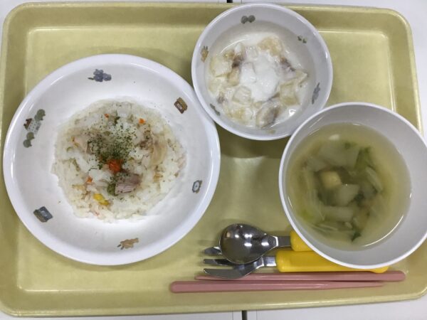 ピラフもスープもやさしい味つけでお野菜がたくさん!お野菜が苦手なお友達ももりもり食べました♪