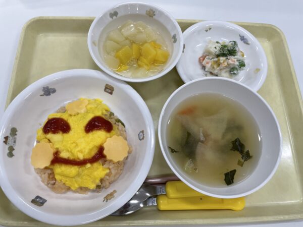 今日はお誕生会メニューでした♪お顔がついたオムライス、みんな喜んで食べましたよ😊