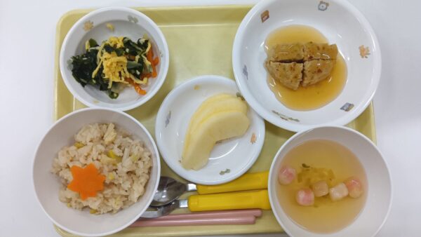 大好きなハンバーグとおいしい栗の炊き込みごはんに、子どもたちも大喜びでした。