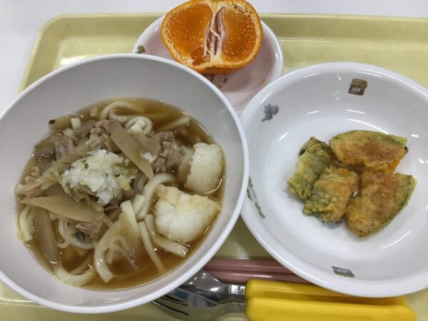 秋田の郷土料理きりたんぽ。うどんと一緒に「いただきます」。